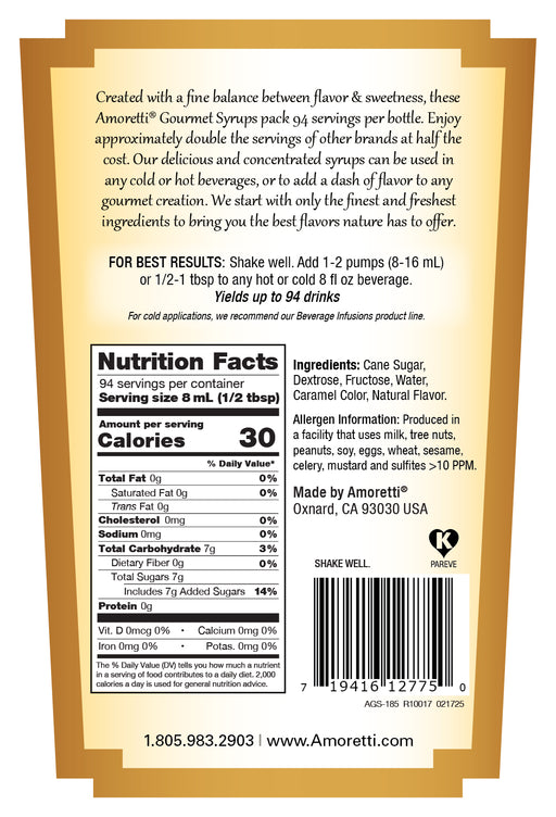 Amoretti Item #303 Natural Flavors No high fructose corn syrup Shelf stable, even after opening More concentrated than competitive brands Certifie...