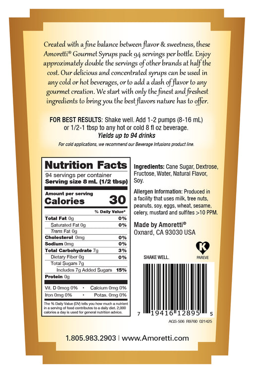 Amoretti Item #352 Natural Flavors No high fructose corn syrup Shelf stable, even after opening More concentrated than competitive brands Certifie...