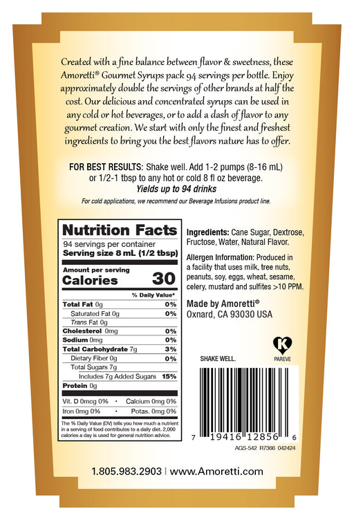 Amoretti Item #393 Natural Flavors No high fructose corn syrup Shelf stable, even after opening More concentrated than competitive brands Certifie...