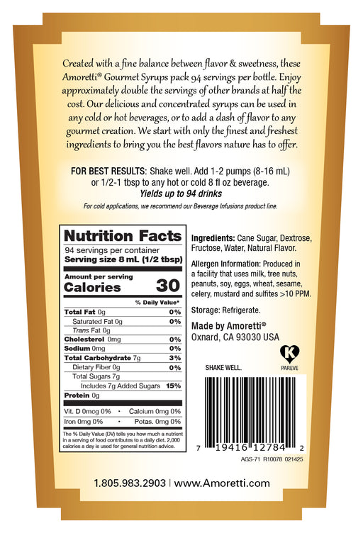 Amoretti Item #3085 Natural Flavors No high fructose corn syrup Shelf stable, even after opening More concentrated than competitive brands Certifi...